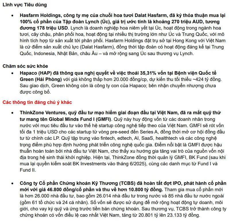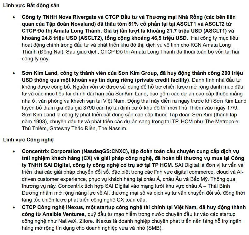 Trong tháng 9/2025, thị trường M&A Việt Nam ghi nhận 32 thương vụ với tổng giá trị công bố và ước tính đạt khoảng 762 triệu USD. Bất động sản, Logistic & Hạ tầng, sản xuất công nghiệp và hàng tiêu dùng tiếp tục là những lĩnh vực dẫn đầu cả thị trường.