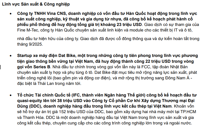 Xét về số lượng, các lĩnh vực Logistics & Hạ tầng và Sản xuất công nghiệp dẫn đầu với 5 thương vụ mỗi lĩnh vực, tiếp theo là Công nghệ với 4 thương vụ. Dù nhận được sự quan tâm đáng kể từ nhà đầu tư, phần lớn giao dịch trong lĩnh vực Công nghệ vẫn ở giai đoạn sớm và quy mô nhỏ.
